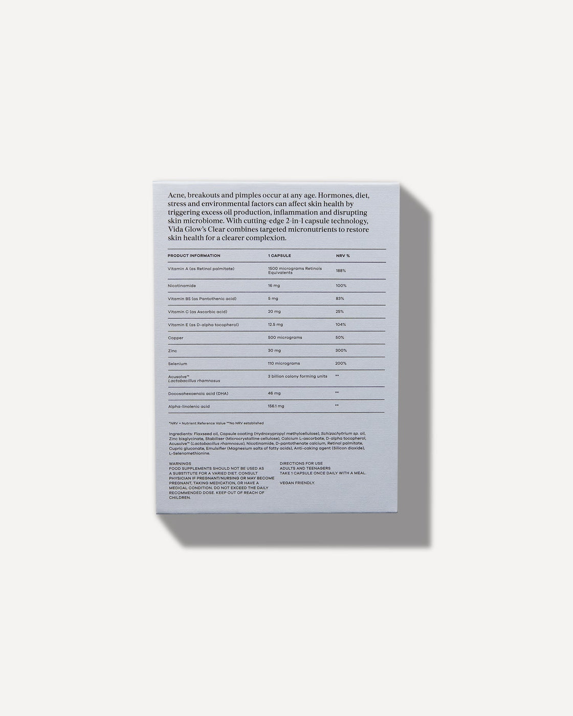 Integrated into your daily regime, Clear is a once-daily formula to address acne concerns in both men and women. Our easy-to-consume vegan capsules are tasteless and odourless. For calmer, clarified skin and visible results after just 1 month of consistent supplementation. (1).