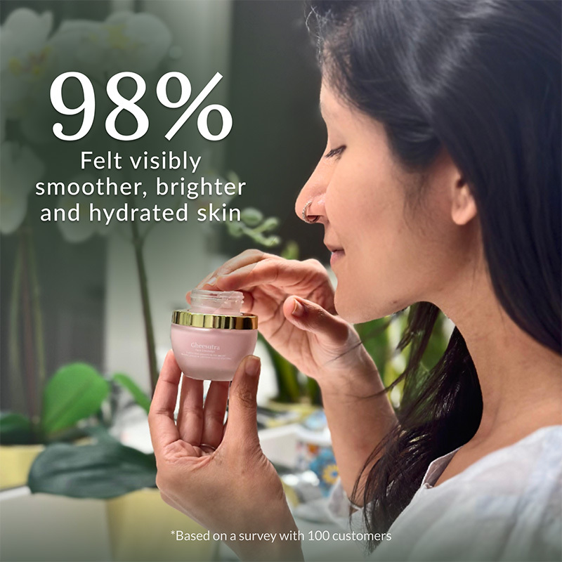 If your skin is craving something deeper than a standard moisturizer, something that absorbs into the layers where dryness and early aging actually begin, Gheesutra was made for that. Handcrafted over two weeks using organic A2 ghee in a unique churning process, this award-winning emulsion penetrates the skin's deepest layers to deliver intense, lasting hydration while supporting collagen production and a satin-smooth finish. Suitable for all skin types, especially those dealing with dryness, loss of firmness, or visible signs of aging.